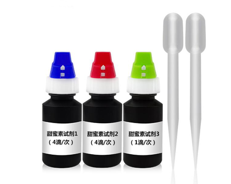 吸取 0.5ml 樣品于 10ml 比色管中,加入 1.5ml 蒸餾水(或純凈水),加入 4滴甜蜜素檢測(cè)試劑1、4滴甜蜜素檢測(cè)試劑2,搖勻比色管中的溶液,靜置片刻,接著滴加 1 滴甜蜜素檢測(cè)試劑 3,滴加后立即搖動(dòng) 1 分鐘,在搖動(dòng)的過(guò)程中將蓋上蓋子,放置2分鐘,搖勻后觀察溶液的渾濁度,與檢測(cè)色階卡進(jìn)行比較,即可得到甜蜜素含量。