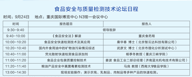 快檢培訓(xùn)班已在北京舉辦九期,第十期與往常不同,在重慶。您一定很好奇,為什么這次培訓(xùn)班安排在重慶,如果您關(guān)注我們的網(wǎng)站及微博、微信,您會(huì)發(fā)現(xiàn),智云達(dá)受邀參加由中國(guó)儀器儀表學(xué)會(huì)牽頭的四家機(jī)械行業(yè)專業(yè)組織2015年9月22日-25聯(lián)合在重慶國(guó)際展覽中心共同舉辦“中國(guó)(重慶)智能制造技術(shù)裝備博覽會(huì)”(簡(jiǎn)稱智博會(huì))。為了讓客戶和學(xué)員有參與高質(zhì)量技術(shù)論壇,學(xué)習(xí)更多除快檢常識(shí)外知識(shí)的機(jī)會(huì),本次培訓(xùn)班特改為參加食品安全與質(zhì)量檢測(cè)技術(shù)論壇。