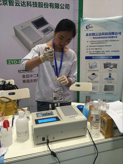 在“科學儀器走進百姓生活”活動展示區,北京智云達為參會觀眾現場開展免費的食品安全檢測展示,現場進行了果蔬中農藥殘留檢測、食品中二氧化硫檢測等演示實驗,圍觀群眾不時提出疑問,現場技術人員一一解答。