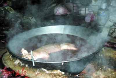 在查獲現(xiàn)場(chǎng),記者看到違法人員臨時(shí)搭建的私宰帳篷里,地上鋪滿了豬血和豬毛的混合物,生豬糞便隨著水流漸漸形成一條“小河”流向遠(yuǎn)處,殺豬刀、鐵鉤、鐵叉等用于私宰的工具隨意擺放在地上,與豬毛、豬血、糞便等混合在一起,現(xiàn)場(chǎng)一口直徑近2米的大鍋盛滿了水,熱氣騰騰。深圳市市場(chǎng)稽查局食品稽查處的執(zhí)法人員告訴記者,這口大鍋是用來(lái)給生豬褪毛的,隨后就在骯臟的環(huán)境下進(jìn)行屠宰和分割、裝填貨車(chē),這樣的豬肉其質(zhì)量可想而知。