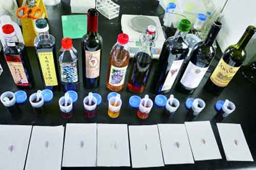 北京智云達技術工程師楊老師和王老師通過使用北京智云達自主研發生產的快速檢測產品:紅葡萄酒摻偽速測盒,對樣品溶液進行檢測。