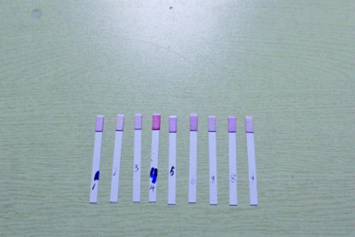 9種樣品取樣檢測后,檢測試紙顏色基本未變,也未呈現藍紫色。