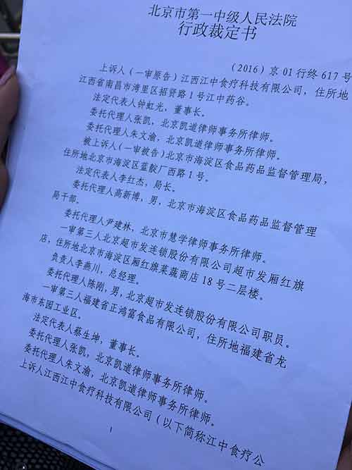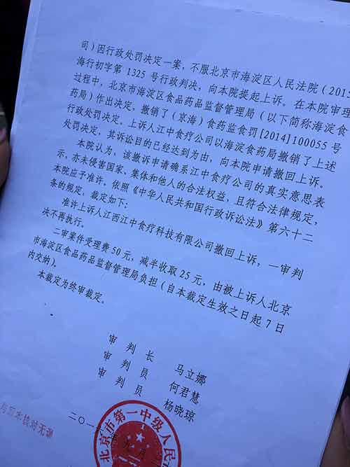 北京市第一中級人民法院的行政裁定書內容顯示,海淀區食藥監局已撤銷對江中此前的行政處罰決定。 澎湃新聞記者 王文秋 圖