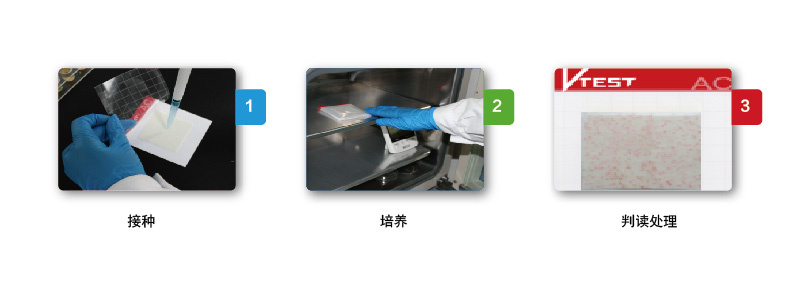 V—TEST ®微生物快速檢測試紙片為預制型培養基系統,由上層薄膜層、中層無紡布、下層底板組成。將特定的培養基和指示劑附著在載體上,通過微生物在上面生長、指示劑顯色來測定食品中的微生物。本適用于食品及原料中致病菌的測定,也可以用于食品加工環境中的致病菌的測定以及現場執法等檢測。