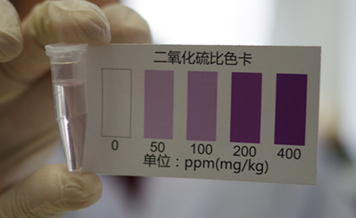 放置5分鐘觀察顏色變化,并與色卡對照,得出樣品中二氧化硫并未達(dá)到50 mg/kg,因此判斷二氧化硫含量未超標(biāo)。